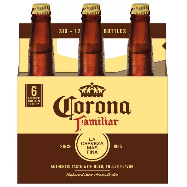 Rooted in authentic, rich heritage, Corona Familiar Lager Beer is a bright, golden-colored pilsner that is balanced with moderate bitterness and a light finish. A Mexican lager style beer, Corona Familiar combines a full-flavored, light- to medium-body lager beer with the bright, crisp taste for which Corona beer is known. Smooth to drink, this Mexican beer's light carbonation and slight head make it the perfect complement to Mexican food. This imported beer is ideal for gatherings with close friends and family, where the tradition of sharing creates meaningful experiences. In a very shareable beer 6 pack, this traditional cerveza is the perfect tailgating beer. Containing 154 calories per 12 oz serving and 4.8% alcohol by volume, Corona Familiar is the taste of a great tradition. Drink responsibly. Corona Familiar® Beer. Imported by Crown Imports, Chicago, IL