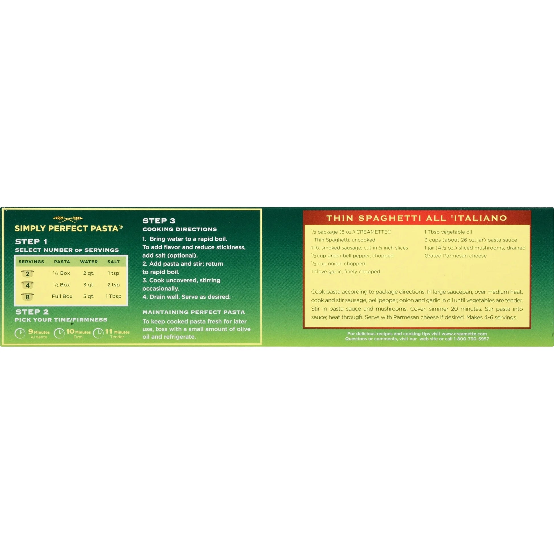 Creamette Thin Spaghetti is made with quality ingredients and stands out as our most beloved pasta. This pasta contains no preservatives or MSG and is non-GMO. With a cook time of 10-12 minutes, you can enjoy quality time with your family over a delicious meal. Pair this thin pasta with tomato or cream sauces, broth-based sauces, olive oil tosses and meat sauces. As a versatile pasta, spaghetti can be used in entrées, side dishes, cold salads, and soups. Each order includes one 16 oz. (450g) box of enriched Creamette Thin Spaghetti pasta.Dedicated to Simply Perfect Pasta® since 1912, we hope to put our pride and joy on your table and a smile on your face.