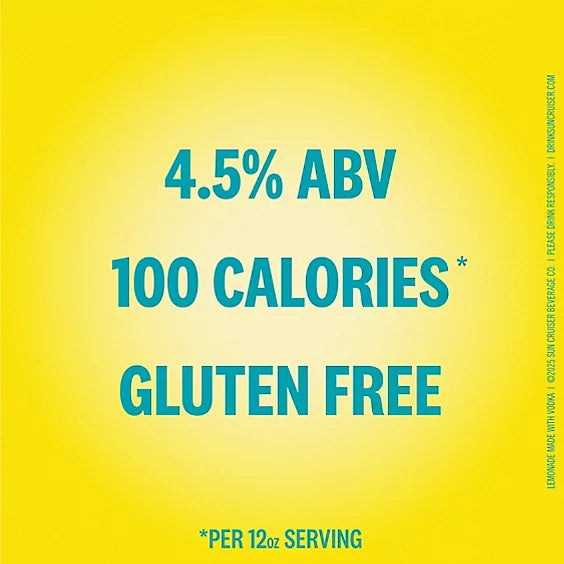 Sun Cruiser Lemonade Vodka is made with real lemonade and premium vodka. It's the ultimate balance of sweet and tangy for a taste that is refreshingly smooth. The Variety Pack has four flavors, two cans each of Lemonade, Lemonade & Iced Tea, Pink Lemonade, and Strawberry Lemonade. With no bubbles, 4.5% ABV, and only 100 calories per 12oz can, it’s the perfect drink for any time of day. Let the good times cruise. Gluten free. No carbonation.